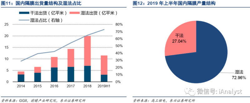 從技術(shù)路線角度講,濕法隔膜已經(jīng)取代干法隔膜逐漸成為主流。兩種隔膜因為生產(chǎn)的過程和技術(shù)存在差異,因此導(dǎo)致產(chǎn)品成本和性能存在差異。濕法隔膜因為更輕薄有助于能量密度提升。濕法隔膜不斷替代干法隔膜市場,如圖11所示,2019年上半年濕法隔膜比例已經(jīng)達到72.96%,如圖12所示。我們認為,濕法隔膜是未來主流方向,干法隔膜將以自身的成本優(yōu)勢更多應(yīng)用于磷酸鐵鋰離子電池等領(lǐng)域。