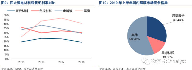 四大鋰電材料行業(yè)的平均毛利率水平如圖9所示,2019年上半年國內(nèi)隔膜行業(yè)競爭格局如圖10所示。