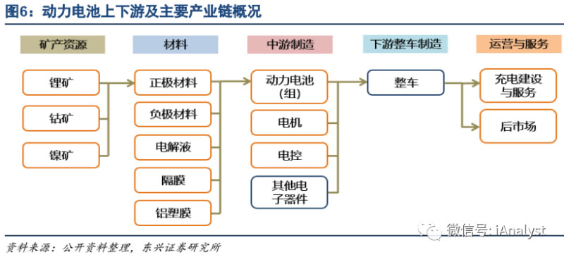 動力電池產(chǎn)業(yè)鏈是新能源汽車產(chǎn)業(yè)鏈上的一部分,整個產(chǎn)業(yè)鏈較長,上游可追溯到鋰、鈷、鎳等礦產(chǎn)資源端,中游是四大鋰電材料及其他輔助材料,動力電池的下游是新能源汽車,整車之后是下游運營與服務(wù)等環(huán)節(jié)。動力電池上下游及主要產(chǎn)業(yè)鏈概況如圖6所示。