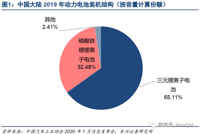 鋰離子動力電池作為應(yīng)用最廣泛的動力電池,一般根據(jù)正極材料的不同又分為三元鋰離子動力電池、磷酸鐵鋰鋰離子動力電池、錳酸鋰鋰離子動力電池等。其中以磷酸鐵鋰作為正極材料的電池充放電循環(huán)壽命長,但其缺點是能量密度、高低溫性能、充放電倍率特性方面有一定不足,且生產(chǎn)成本較高;錳酸鋰離子電池能量密度低、高溫下的循環(huán)穩(wěn)定性和存儲性能較差;而三元鋰離子動力電池因具有綜合性能和成本的雙重優(yōu)勢,逐漸被行業(yè)所關(guān)注和認同,超越磷酸鐵鋰鋰離子電池和錳酸鋰鋰離子電池成為主流的技術(shù)路線。2019年國內(nèi)動力電池市場裝機量結(jié)構(gòu)如圖1所示。