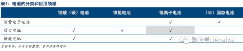 動力電池是指專用于新能源汽車上的電池,是新能源汽車出現(xiàn)之后的專有名詞,與消費電子電池、儲能電池共同組成了電池的三大應(yīng)用領(lǐng)域。按照電池的種類分,有鉛酸電池、鎳氫電池、鋰離子電池、固態(tài)電池等。鋰離子電池天然具有能量密度高、占地小、長循環(huán)壽命等有點,是目前最重要的動力電池品類。電池的分類和應(yīng)用領(lǐng)域如表1所示。