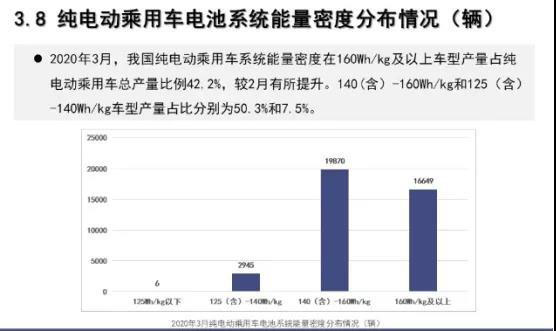 純電動乘用車系統(tǒng)能量密度在160Wh/Kg以上車型產量占純電動乘用車總產量42.2%;較2月有所提升。140(含)-160Wh/Kg和125(含)-140Wh/Kg車型產量占比分別為50.3%和7.5%。