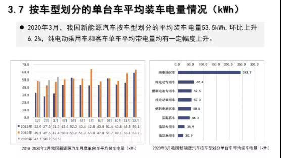 按車型劃分的單臺車平均裝車電量情況顯示,3月,我國新能源汽車按車型劃分的平均裝車電量53.5kWh,環(huán)比上升6.2%。