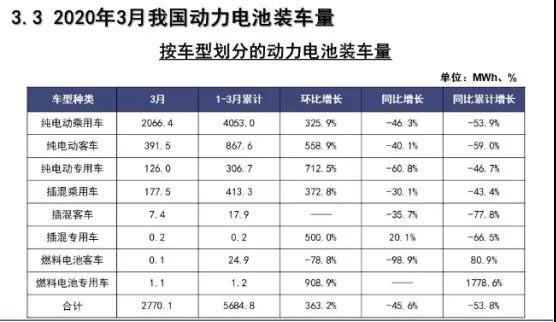 2020年1-3月,我國動力電池裝車量累計5.7GWh,同比累計下降53.8%。其中三元電池裝車量累計4.3GWh,占總裝車量76.1%,同比累計下降53.0%;磷酸鐵鋰電池裝車量累計1.3GWh,占總裝車量23.5%,同比累計下降52.3%。