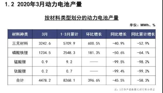 中國汽車動力電池產業(yè)創(chuàng)新聯盟同日發(fā)布了新能源汽車動力電池月度數據,3月我國動力電池產量共計4.5GWh,同比下降45.5%,環(huán)比增長396.6%。其中三元電池產量3.2GWh,占總產量72.4%,同比下降40.9%,環(huán)比增長600.5%;磷酸鐵鋰電池產量1.2GWh,占總產量27.6%,同比下降50.6%,環(huán)比增長181.3%。