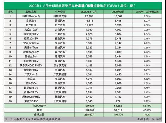 2020年1-2月全球新能源乘用車銷量TOP 20車型中,動力電池配套主要集中在LG化學、松下、寧德時代(CATL)、三星SDI、SKI和遠景AESC等少數(shù)幾家企業(yè)當中。