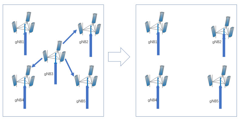 5G基站各個扇區(qū)流量遷移具體實現(xiàn)情況如圖3所示:gNB3基站的三個扇區(qū)向周邊基站實現(xiàn)流量遷移方向如箭頭所示,接收基站gNB3流量的基站gNB2、gNB4、gNB5能夠完全接收gNB3三個扇區(qū)的流量;gNB3基站完成流量遷移后開啟休眠或者關(guān)段模式,暫時退出網(wǎng)絡運營。