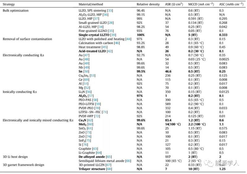 表1:近幾年報(bào)道的改善界面問題的數(shù)據(jù)匯總。主要包括電解質(zhì)片或中間層的制備方法、LLZO的致密度、面電阻(ASR)、文獻(xiàn)中報(bào)道的最大的電流密度(MCCD包含電池的臨界電流密度)以及面容量(ASC)等信息。