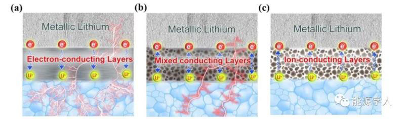 圖4:(a)電子導(dǎo)電中間層,(b)混合導(dǎo)電中間層,(c)離子導(dǎo)電中間層的鋰聚集與生長情況。