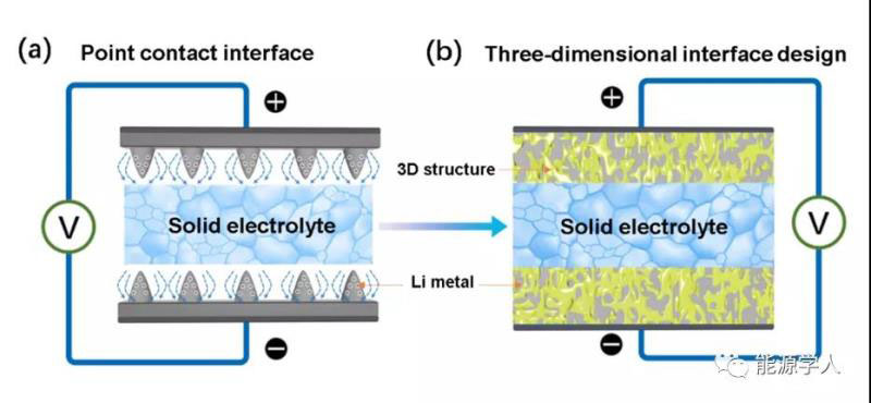 c-LLZO電解質(zhì)通常被加工成平的圓片狀,以此構(gòu)成的對稱電池的表觀面積等于電解質(zhì)和鋰金屬之間的二維接觸面積,如圖3(a)所示,這時(shí)表觀電流密度與實(shí)際的面電流密度一致。當(dāng)面電流密度超過一定值時(shí),電解質(zhì)就會(huì)被鋰生長貫穿。如果是具有三維結(jié)構(gòu)的界面,如圖4(b)所示,表觀面積要遠(yuǎn)小于電解質(zhì)和鋰金屬之間的實(shí)際接觸面積。這樣施加同樣的電流,對稱電池可表現(xiàn)出更大的臨界電流密度,即表觀臨界最大電流密度增加,但單位面積的臨界電流密度保持是保持不變的。因此,這種方法是提高了陶瓷片電解質(zhì)的臨界電流而不是臨界電流密度。
