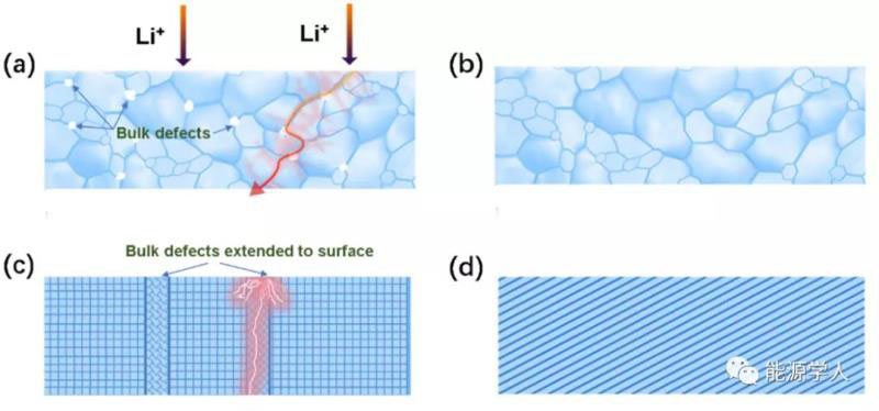 如圖1(c)所示,c-LLZO陶瓷片或單晶內(nèi)部的缺陷會(huì)擴(kuò)展到表面,表面的缺陷位點(diǎn)極易導(dǎo)致Li的聚集從而成核,再進(jìn)一步加劇了局部電場分布的不均勻,最終促成鋰在電解質(zhì)層的生長穿透。如果在理想情況下,c-LLZO是無缺陷的單晶體,鋰的成核和生長的發(fā)生會(huì)十分困難,如圖1(d)所示,這種情況無疑將強(qiáng)有力抑制鋰的生長。