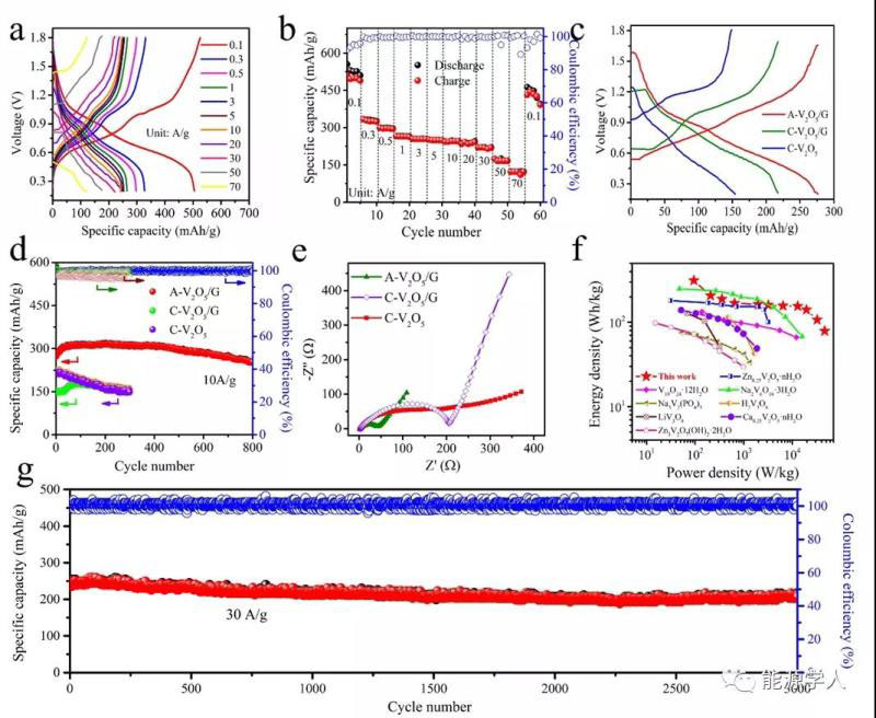 由于此二維異質(zhì)結(jié)有效耦合了高導(dǎo)電的石墨烯和無定形V2O5的優(yōu)點(diǎn),具有構(gòu)建高性能鋅離子電池的潛力。如圖3a所示,在0.1到70A/g的電流密度下,充放電曲線在1.0/0.8和0.6/0.5 V時(shí)有明顯的氧化還原峰,證實(shí)了兩電子傳輸?shù)臋C(jī)制。同時(shí),在0.1 A/g時(shí)表現(xiàn)出超高的容量489 mAh/g,超過了目前所有報(bào)道的釩基材料。在0.1,0.3,0.5,1,3,5,10,20,30,50和70 A/g的電流密度下,該電池分別表現(xiàn)出489,330,299,266,254,250,247,237,221,175和123 mAh/g的容量(圖3b)。作為對(duì)比,無定形V2O5異質(zhì)結(jié)(A-V2O5/GZIBs),晶型V2O5異質(zhì)結(jié)(C-V2O5/G ZIBs)和無石墨烯的晶型V2O5(C-V2O5 ZIBs)也被分別應(yīng)用于此鋅離子電池。圖3c所示,在10 A/g的電流密度下,A-V2O5/GZIBs具有276 mAh/g的高容量,而C-V2O5/GZIBs和C-V2O5 ZIBs只具有217 mAh/g和154 mAh/g的容量。同時(shí),800個(gè)充放電循環(huán)后,A-V2O5/GZIBs容量保持率有93%,而C-V2O5/GZIBs和C-V2O5 ZIBs在300個(gè)循環(huán)后只有68%和97%的容量保持率(圖3d)。據(jù)Ragone圖所示,該A-V2O5/GZIBs具有優(yōu)異的功率密度46 kW/kg和能量密度313Wh/kg(基于正極材料活性物質(zhì)質(zhì)量)。同時(shí),在30A/g下,循環(huán)3000圈后,容量保持率仍然高達(dá)87%。