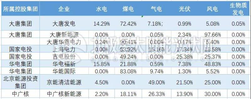 各企業(yè)2019年各類型能源具體裝機(jī)容量如下: