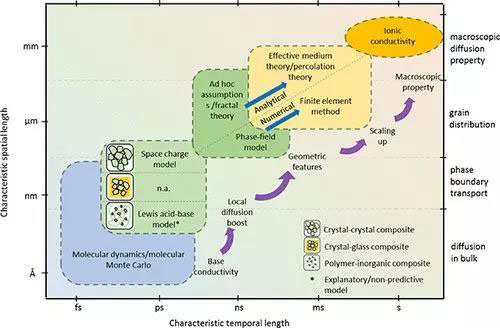 上述機(jī)制僅僅是最底層的微觀層面高離子電導(dǎo)率來(lái)源,僅僅描述兩相界面附近的微觀行為,而不能直接反映宏觀情況。宏觀離子電導(dǎo)率與微觀界面增強(qiáng)機(jī)制之間由相的分布情況聯(lián)系。本文中對(duì)利用相分布逐步將微觀界面電導(dǎo)scale up成宏觀電導(dǎo)率的方法也做了總結(jié),主要有有效介質(zhì)理論、percolation理論、有限元模型等。最終提出了復(fù)合固態(tài)電解質(zhì)的多尺度理論設(shè)計(jì)框架,如圖5所示。