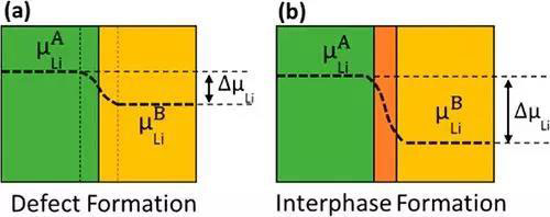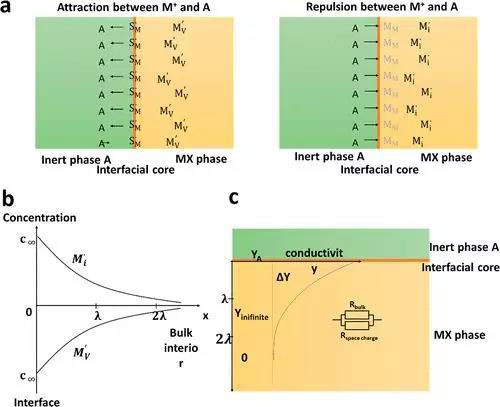 (2) 空間電荷層效應(yīng)。在復(fù)合物的相-相界面上,界面能并不總足夠大從而誘導(dǎo)相變,但有時(shí)候在未相變時(shí),復(fù)合物也具有較高的離子電導(dǎo)率。這就涉及到空間電荷層效應(yīng)引起的缺陷重排。由于兩種相之間鋰的化學(xué)勢(shì)不同,界面附近會(huì)產(chǎn)生電場(chǎng)效應(yīng),并導(dǎo)致大量具有活動(dòng)性的鋰缺陷產(chǎn)生,這些鋰缺陷作為載流子,能夠大大提高了沿著界面的離子電導(dǎo)率。