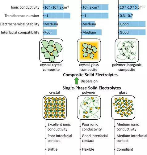 文章首先從定義上闡釋了復(fù)合固態(tài)電解質(zhì)的內(nèi)涵并對(duì)一些不當(dāng)?shù)姆Q(chēng)呼進(jìn)行了糾正。從本質(zhì)上,復(fù)合固態(tài)電解質(zhì)是在宏、介觀層面由不同相組成的離子導(dǎo)體,因而不能與原子級(jí)別混合得到的固溶體、金屬間化合物等混淆。接著,文章對(duì)復(fù)合固態(tài)電解質(zhì)的分類(lèi)和特性作了總結(jié),由圖1可以看出,復(fù)合固態(tài)電解質(zhì)能夠避開(kāi)單一相電解質(zhì)的弱點(diǎn),從而得到較好的綜合性質(zhì)。