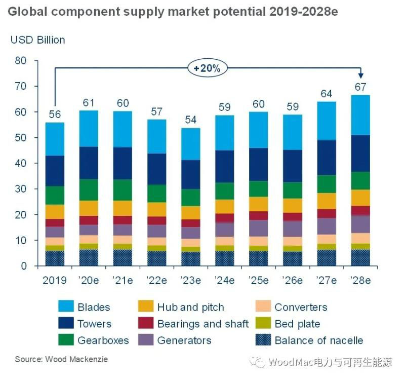 據(jù)伍德麥肯茲最新研究報告《2020年全球風(fēng)機供應(yīng)鏈?zhǔn)袌鲅芯俊?,預(yù)計2020年至2028年期間,全球風(fēng)機供應(yīng)鏈潛在市場價值將達到6千億美元,較2019年預(yù)測數(shù)據(jù)上調(diào)8%。