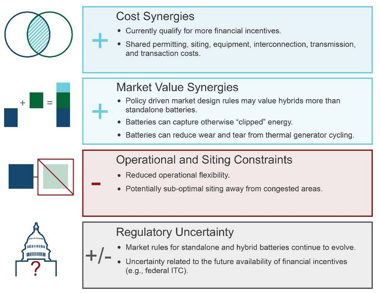 將可再生能源發(fā)電設(shè)施和電池儲(chǔ)能系統(tǒng)共址部署可以節(jié)省共享設(shè)備和互連成本,并可以充分利用有利于太陽(yáng)能發(fā)電設(shè)施和電池儲(chǔ)能系統(tǒng)配套部署的美國(guó)聯(lián)邦稅收抵免政策。相對(duì)于獨(dú)立部署的發(fā)電設(shè)施,電力系統(tǒng)運(yùn)營(yíng)商和購(gòu)買者可能更喜歡應(yīng)用混合部署的發(fā)電設(shè)施,因?yàn)樗鼈兙哂懈蟮恼{(diào)度靈活性。但是將發(fā)電設(shè)施和電池儲(chǔ)能系統(tǒng)共址部署,可能并不總是一個(gè)最佳的解決方案。
