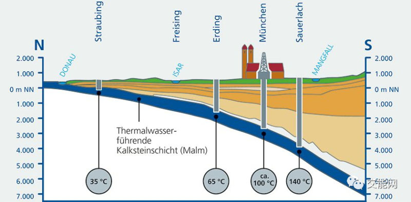 位于慕尼黑及其周邊的巴伐利亞磨拉石盆地是德國最大的潛在地?zé)崮苜Y源之一。地下2000米到4000 米有80到140攝氏度的熱水儲藏。因此慕尼黑市計劃在2040年成為第一個區(qū)域供熱系統(tǒng)完全由可再生能源供給的德國城市,其中地?zé)崮転楣岬闹饕獊碓础?
