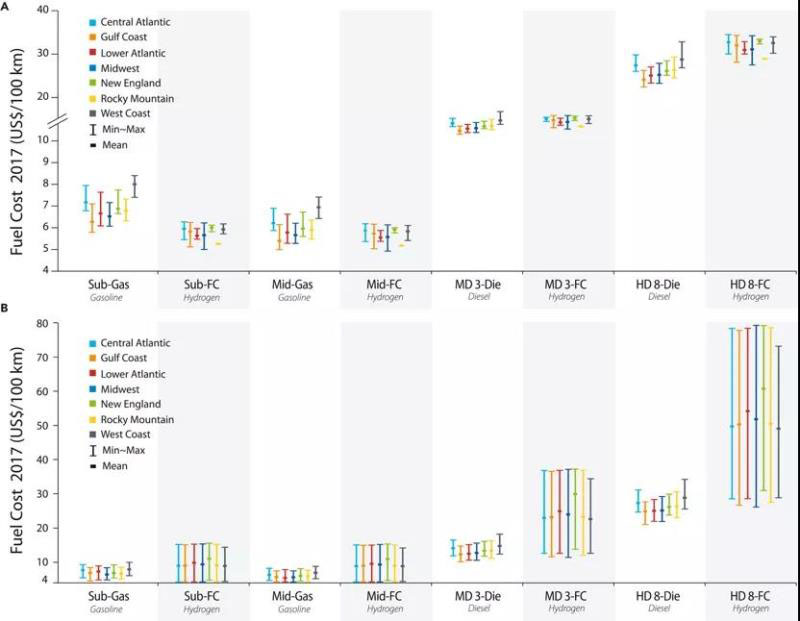 除制氫的電力成本外,通過比較不同類型燃料的成本,探討氫燃料電池電動車與汽油車、柴油車在區(qū)域范圍內(nèi)的成本競爭力。