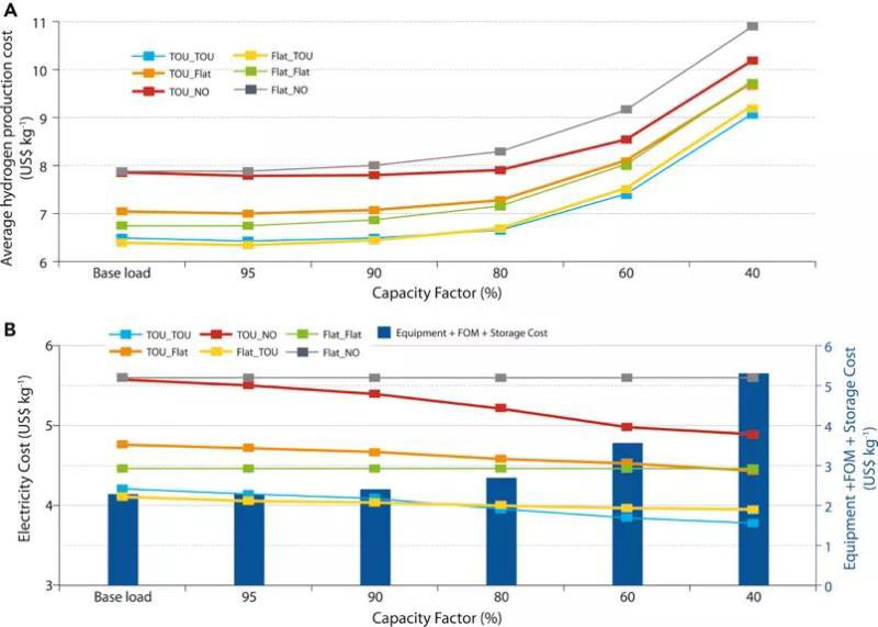 1)對于不對基本電費或峰值電費使用動態(tài)定價的模式,總氫生產(chǎn)成本(每種類別的電費的平均成本)隨著產(chǎn)能因子的降低而單調(diào)增加。這是因為對于Flat_NO和Flat_Flat電費,電力成本是恒定的,而設(shè)備,固定操作和維護(FOM)和存儲成本隨產(chǎn)能因子的降低而按比例增加。