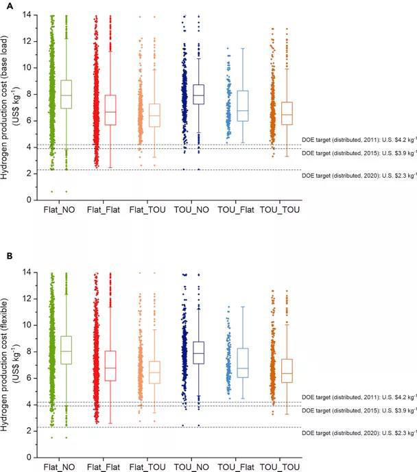 本研究中采用RODeO實驗程序結(jié)合要點1分析的電費對電解槽的基本負荷和靈活運行模式的制氫成本進行估算。美國能源部(DOE)電解制氫的技術(shù)目標(biāo)分別是2011年,2015年和2020年分別為4.2千克/美元,3.9千克/美元和2.3千克/美元。成本估算發(fā)現(xiàn),F(xiàn)lat_Flat,F(xiàn)lat_NO,F(xiàn)lat_TOU和TOU_TOU四種類型的電價結(jié)構(gòu)下電解制氫成本已經(jīng)實現(xiàn)了美國能源部2011年的氫氣生產(chǎn)目標(biāo)。此外,全美81個商業(yè)和工業(yè)電費,可以使得電解制氫成本(包括存儲成本)控制在4千克/美元以內(nèi)。