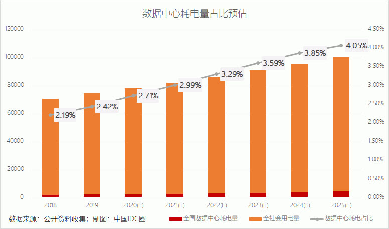 2018年,全國數(shù)據(jù)中心總耗電量1500億千瓦時,達到了社會總用電量的2%。預計到2025年,占比將增加一倍,達到4.05%。