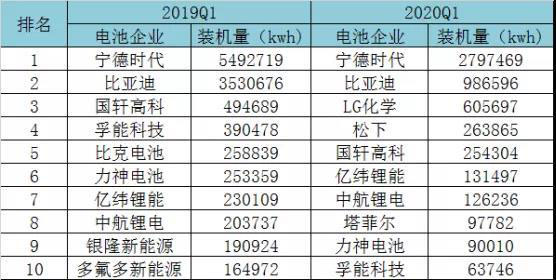 受疫情影響,2020年Q1動(dòng)力電池整體競(jìng)爭(zhēng)格局發(fā)生較大變化,TOP10裝機(jī)排名較去年同期變動(dòng)較大。