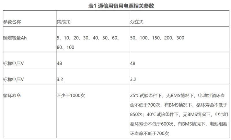 通信基站出于安全方面的考慮,對電池材料進(jìn)行了限制,僅使用磷酸鐵鋰電池。電池分為分立式和集成式兩種,兩者的區(qū)別在于電池模塊與電池管理系統(tǒng)是否集成為一體。廢舊電池在這兩種形式的電源上均能實(shí)現(xiàn)梯次利用,對比兩種電源的相關(guān)標(biāo)準(zhǔn)(YD/T?2344.1—2011 通信用磷酸鐵鋰電池組?第1部分:集成式電池組、YD/T 2344.2-2015 通信用磷酸鐵鋰電池組 第2部分:分立式電池組),可以看出兩者僅在循環(huán)壽命的要求上存在較大差異,其他指標(biāo)要求幾乎相同。