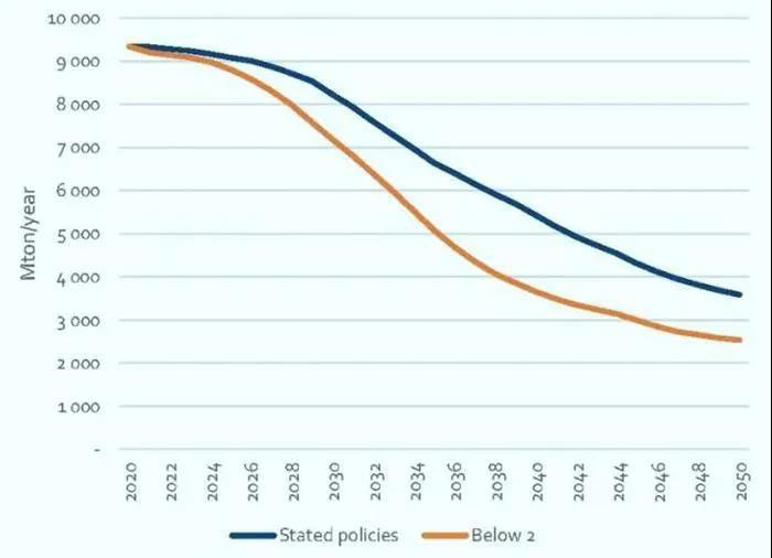 圖2 2018-2050年間兩種場景下能源領域CO2排放量對比