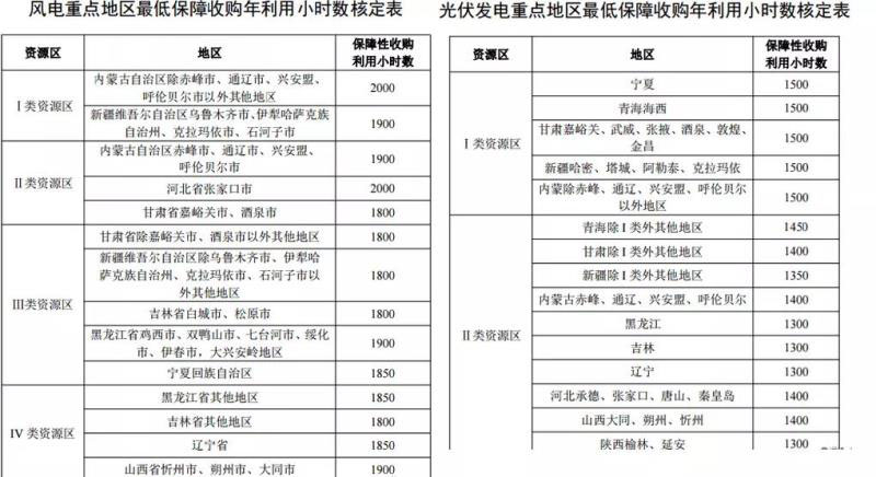 國(guó)家規(guī)定的風(fēng)電、光伏保障小時(shí)數(shù)如下表所示。