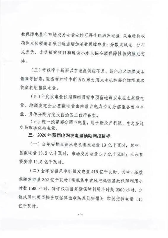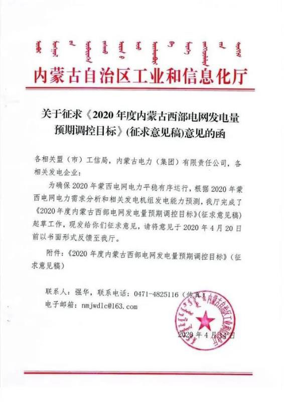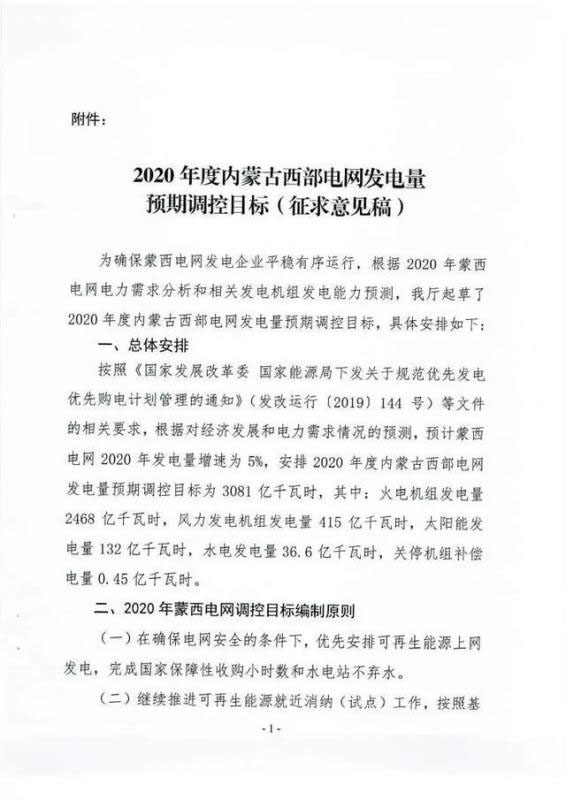 2020年4月20日,內(nèi)蒙古工業(yè)和信息化廳發(fā)布《2020年度內(nèi)蒙古西部電網(wǎng)發(fā)電量預(yù)期調(diào)控目標(biāo)(征求意見稿)》,提出:擬安排2020年度內(nèi)蒙古西部電網(wǎng)發(fā)電量預(yù)期調(diào)控目標(biāo)為3081億kWh,其中: