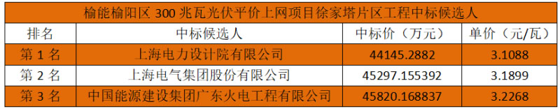 4月17日,陜西榆能榆陽區(qū)300兆瓦光伏平價上網(wǎng)項目徐家塔片區(qū)工程中標候選人公示。上海電力設計院有限公司(以下簡稱“上海院”)以44145.2882萬元的總報價位列第一中標候選人。