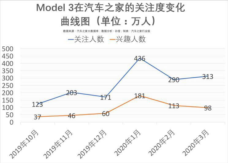 在汽車之家大數(shù)據(jù)庫中,一組數(shù)據(jù)更能說明問題。從2019年第四季度到2020年第一季度,Model 3的關(guān)注人數(shù)始終居高不下,今年1月Model 3正式在上海工廠量產(chǎn)下線,彼時(shí)的關(guān)注人數(shù)更是飆升至436萬人。而此前號(hào)稱對(duì)標(biāo)Model 3的Polestar 2與小鵬P7,同時(shí)期的關(guān)注人數(shù)僅為數(shù)萬人,差距懸殊。