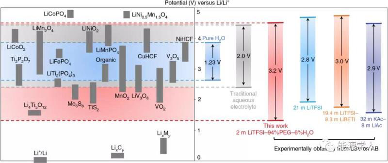 圖4. 各種水系電解質(zhì)和電位電極材料的電化學(xué)窗口穩(wěn)定性的比較