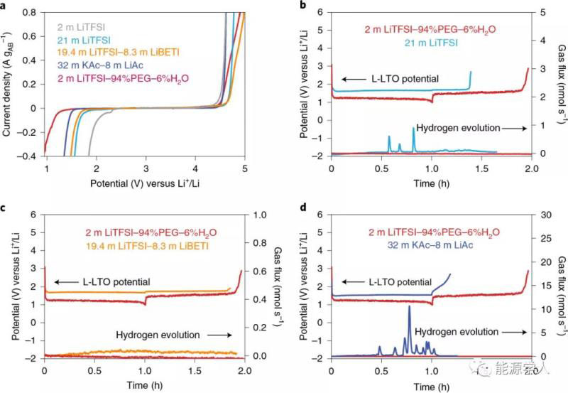 圖3. a)通過LSV確定的各種電解質(zhì)的電化學(xué)穩(wěn)定性窗口;b-d)在21m LiTFSI(b)、水合熔體19.4m LiTFSI-8.3m LiBETI(c)和32m KAC-8m LiAc(d)電解質(zhì)中進(jìn)行的OEMS測試分別與2m LiTFSI-94%PEG-6%H2O的比較。