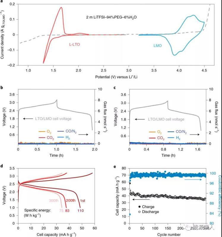 圖2. L-LTO/LMO全電池在2m LiTFSI-94%PEG-6%H2O電解質(zhì)中的電化學(xué)行為和OEMS。a)在2m LiTFSI-94%PEG-6%H2O中LMO和LTO的CV曲線;b, c)L-LTO/LMO全電池在2m LiTFSI-94%PEG-6%H2O中,在第一(b)和第十(c)的OEMS結(jié)果;d)在1C倍率下,L-LTO/LMO全電池在2m LiTFSI-94%PEG-6%H2O中第1、200和300次循環(huán)的充放電曲線;e)相應(yīng)的長循環(huán)性能。