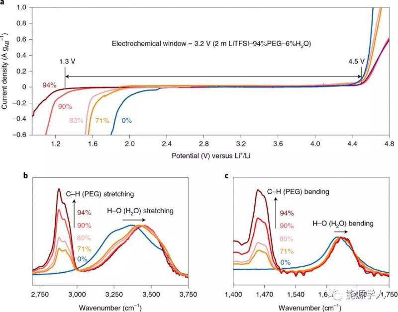 圖1. 分子擁擠型電解質(zhì)的電化學(xué)穩(wěn)定窗口和FTIR光譜。a)LSV測試2m LiTFSI-xPEG-(1-x)H2O(x=0,71,80,90,94%)的電化學(xué)穩(wěn)定性窗口;b, c)一系列2m LiTFSI-xPEG-(1-x)H2O電解質(zhì)的歸一化FTIR。
