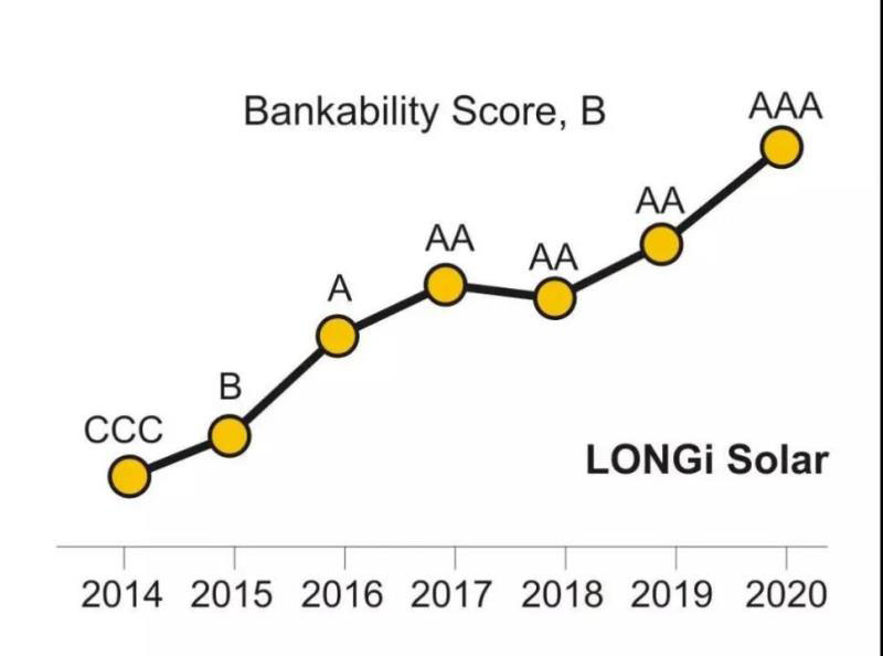 在最新發(fā)布2020年Q1 PV ModuleTech可融資性評(píng)級(jí)報(bào)告中,隆基成為首個(gè)也是唯一一個(gè)獲得AAA評(píng)級(jí)的組件供應(yīng)企業(yè),創(chuàng)下目前該評(píng)級(jí)報(bào)告中所統(tǒng)計(jì)最高水平,也同時(shí)是全球光伏組件供應(yīng)商可達(dá)到的最高級(jí)別。技術(shù)領(lǐng)先讓隆基股份獲得了高速的成長(zhǎng)和發(fā)展,成長(zhǎng)為了全球最大的單晶光伏產(chǎn)品制造商,在全球光伏產(chǎn)業(yè)中取得了領(lǐng)先地位。