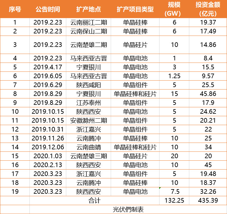 正是在這雄厚“財(cái)力”的加持下,從2019年初,隆基拉開了其加速擴(kuò)產(chǎn)的大幕。據(jù)不完全統(tǒng)計(jì),從2019年至今,隆基共計(jì)宣布了19項(xiàng)擴(kuò)產(chǎn)信息,規(guī)模132GW,投資金額共計(jì)435億元。
