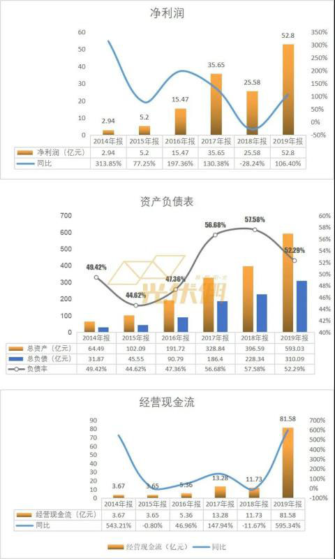 羅馬并非一日建成,隆基用6年的時(shí)間,證明了單晶路線的正確性,同時(shí)也見證了整個(gè)光伏產(chǎn)業(yè)發(fā)生的巨大變化:多晶陣營(yíng)苦苦維系在被淘汰的邊緣、PERC技術(shù)獨(dú)擋潮流……在這六年里,隆基將營(yíng)收從2014年的36.8億元提高至2019年的329億,幾乎翻了10倍;凈利潤(rùn)方面,也一直是光伏企業(yè)的佼佼者,2019年更是史無前例的達(dá)到52.8億元;隨著應(yīng)收賬款的優(yōu)化,2019年企業(yè)經(jīng)營(yíng)現(xiàn)金流暴增近6倍。