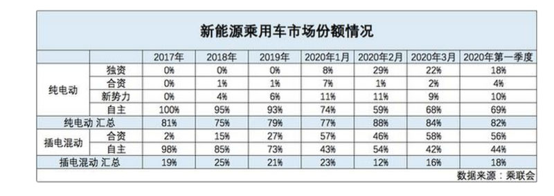 隨著特斯拉正式在國(guó)內(nèi)交付,新能源乘用車市場(chǎng)形成四大“派系”,分別是獨(dú)資車企、合資車企、造車新勢(shì)力和自主品牌傳統(tǒng)車企,在2020年之前自主品牌傳統(tǒng)車企向來是一家獨(dú)大,市占率達(dá)到90%以上,然而進(jìn)入2020年,自主品牌傳統(tǒng)車企的市場(chǎng)份額卻正在被大肆蠶食。