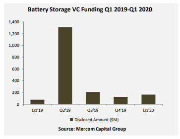 根據(jù)Mercom Capital Group最新融資并購(gòu)報(bào)告“Battery Storage,SmartGrid,and Efficiency Funding and M&A”的數(shù)據(jù)顯示,2020年一季度,全球電池儲(chǔ)能領(lǐng)域的融資總額達(dá)2.44億美元,較2019年一季度有大幅增長(zhǎng),同比增長(zhǎng)88%。其中,風(fēng)險(xiǎn)投資共計(jì)1.64億美元,同比2019年一季度增長(zhǎng)110%,環(huán)比2019年四季度增長(zhǎng)30%。