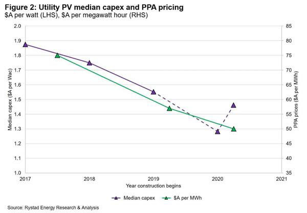 光伏和風(fēng)電資產(chǎn)的大部分資本支出用于組件,約占光伏和風(fēng)電支出的60%和75%。由于組件通常以外幣計(jì)價(jià),澳元貶值對(duì)項(xiàng)目經(jīng)濟(jì)產(chǎn)生了重大影響。圖2突出了光伏資本支出與購(gòu)電協(xié)議(PPA)定價(jià)相比隨時(shí)間變化的趨勢(shì)。