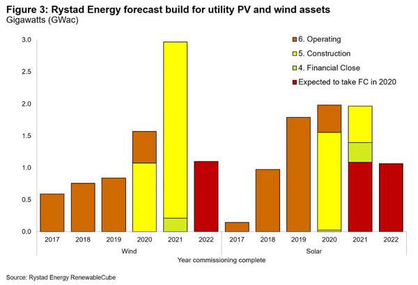 Rystad Energy預(yù)計(jì),到2020年初,將有2-3 GW的可再生能源項(xiàng)目實(shí)現(xiàn)財(cái)務(wù)結(jié)算并于今年開(kāi)始建設(shè),其中包括1.1 GW的風(fēng)能和1-2 GW的光伏。