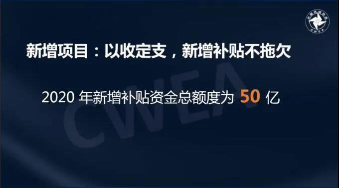 對于新增項目和存量項目的財政補貼,秦海巖秘書長表示,可再生能源補貼政策對于新增項目堅持以收定支、新增補貼不拖欠的原則。據(jù)了解,2020年新增財政補貼資金總額度為50億元,其中光伏約需要15億元、生物質(zhì)能約需要20億元。