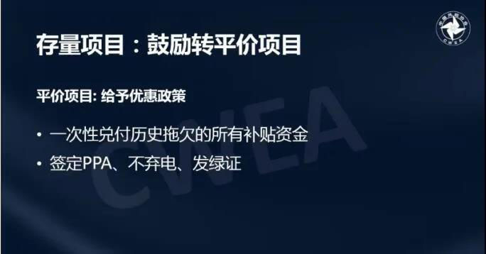 在存量項目的補貼上,可再生能源補貼政策鼓勵存量項目放棄補貼,轉(zhuǎn)為平價項目,并且給予優(yōu)惠政策:一次性兌付歷史拖欠的所有補貼資金,同時簽定PPA、保證不棄電、發(fā)放綠證。