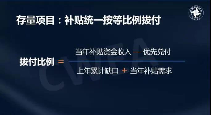 同時,陸上風(fēng)電存量項目的補貼需要統(tǒng)一按照等比例進行撥付。撥付比例是當(dāng)前補貼資金收入減去優(yōu)先兌付的值除以上年累計缺口加上當(dāng)年補貼需求的值。