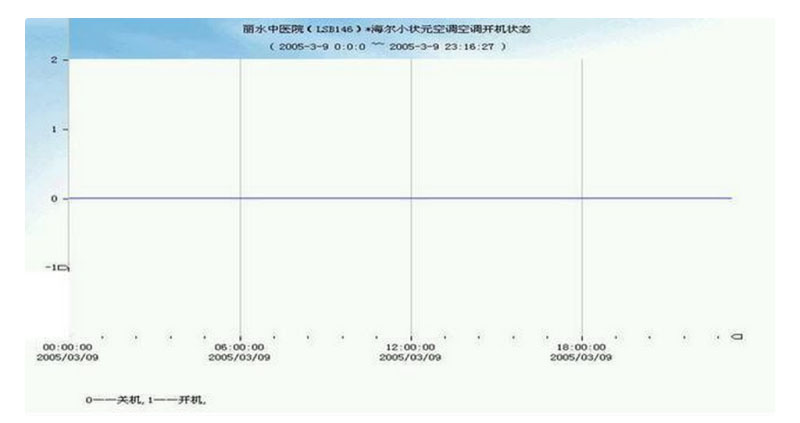 下面以某基站某日全天的測試曲線進(jìn)行說明。圖6 為室內(nèi)外溫度曲線走勢圖(藍(lán)色為室內(nèi)溫度曲線紅色為室外溫度曲線),圖7 為風(fēng)機(jī)開關(guān)機(jī)曲線,圖8 為空調(diào)開關(guān)機(jī)狀態(tài)曲線。