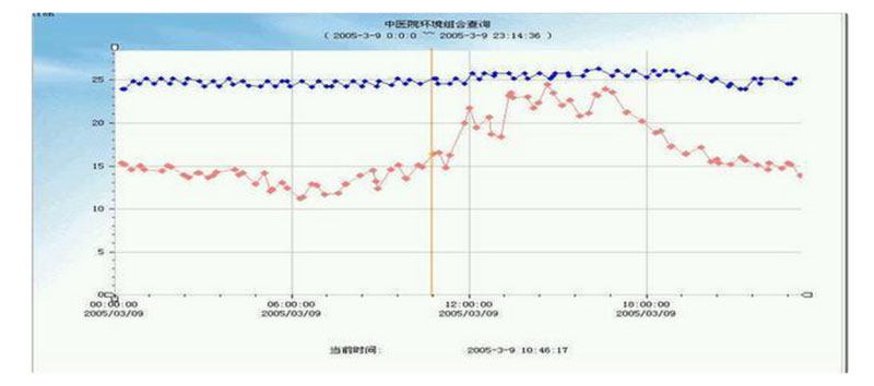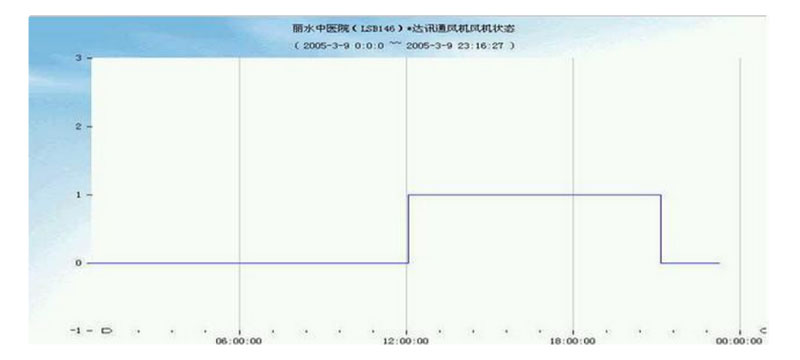 分析:從圖5中可以看出白天氣溫走勢成一個(gè)幾字形走勢,于14時(shí)達(dá)到高峰。對應(yīng)地從圖6可以看出通風(fēng)系統(tǒng)工作正處于這個(gè)幾字形的凸出部分。亦從圖A可以看出室溫度始終保持在25度左右。從圖C可以看出空調(diào)則一直沒有工作。由此證明通風(fēng)系統(tǒng)能對基站機(jī)房恒溫發(fā)揮作用。